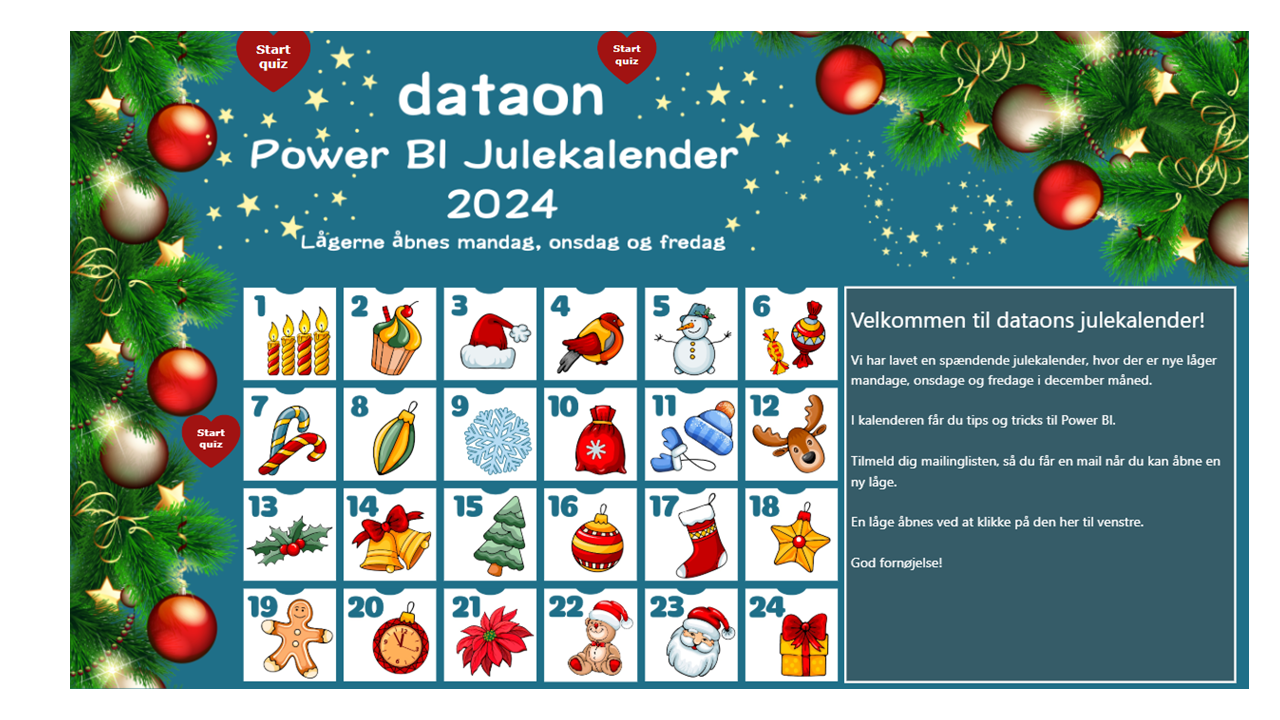 "Vi har lavet en spændende julekalender, hvor der er nye låger mandage, onsdage og fredage i december måned. <br><br>I kalenderen får du tips og tricks til Power BI.<br><br> Tilmeld dig mailinglisten, så du får en mail når du kan åbne en ny låge. <br><br>En låge åbnes ved at klikke på den her til venstre.<br><br>God fornøjelse!"