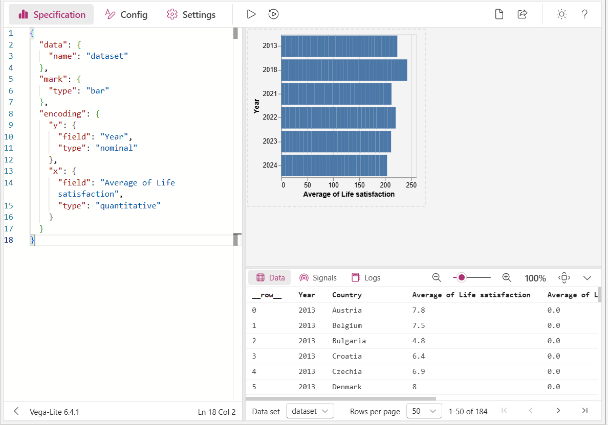 5) I det næste skærmbillede ser du Vega-Lite koden i ventre side, visualiseringen øverst til højre og de rå data nederst til højre: