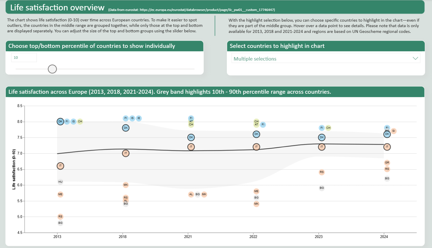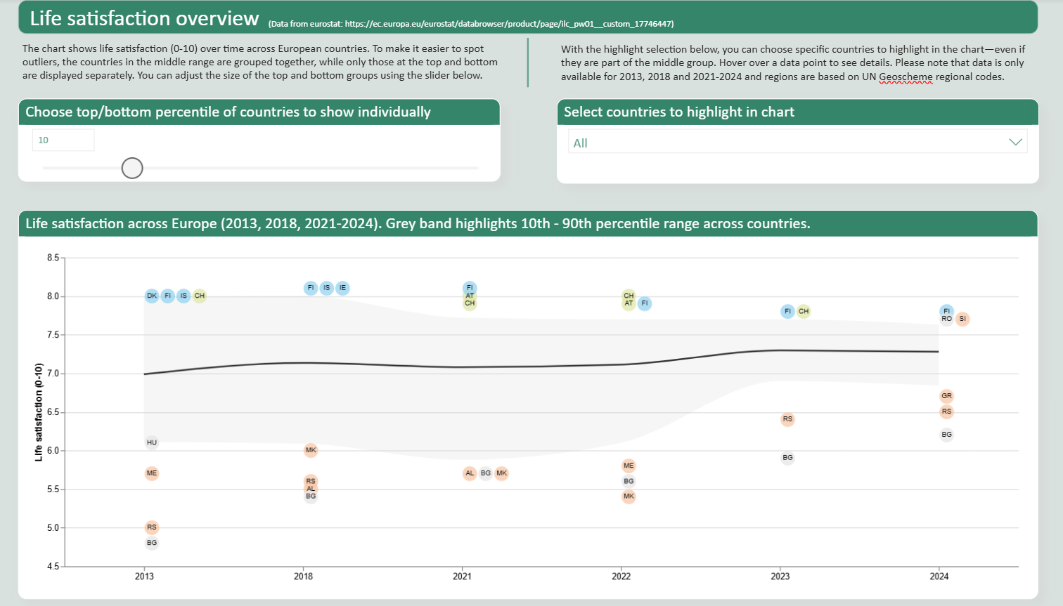 Båndets størrelse kan justeres. Initialt er det sat til 10 %, hvilket betyder, at lande mellem 10 % og 90 % ikke vises individuelt, men indgår i båndet. Den sorte linje i midten viser udviklingen i den maksimale livstilfredshed pr. år og giver et indtryk af den overordnede trend over tid.