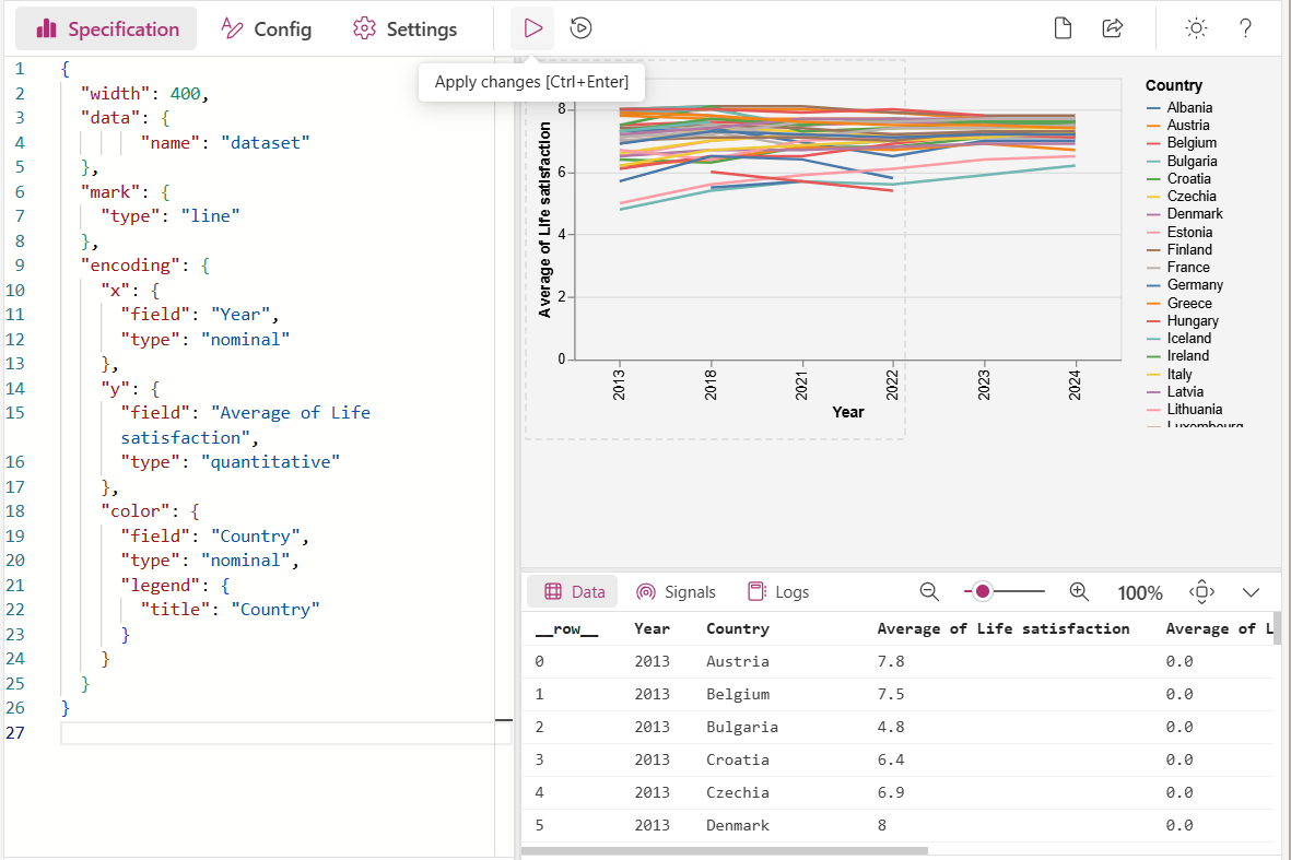 6) For at vise udviklingen i livskvaliteten for hvert land skal diagrammet ændres til et kurvediagram med én linje pr. land og år på x-aksen. Det kræver 6 ændringer i Vega-Lite koden: