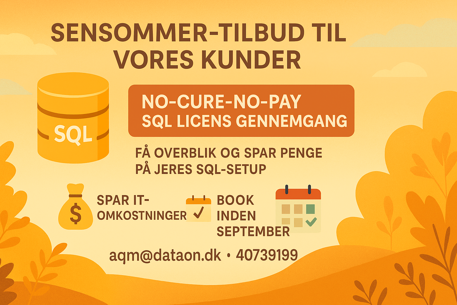 Vi er kommet i sensommerhumør og tilbyder derfor lige nu en no-cure-no-pay SQL licens gennemgang. Formålet er give jer et overblik over optimerings- og besparelsesmuligheder. Vi har god erfaring med at det skaber værdi for vores kunder og de ca. 2 dage som vi skal bruge ude hos jer, vil vi derfor tilbyde at gennemføre uden beregning hvis vi ikke finder noget der kan skabe værdi der modsvarer det.